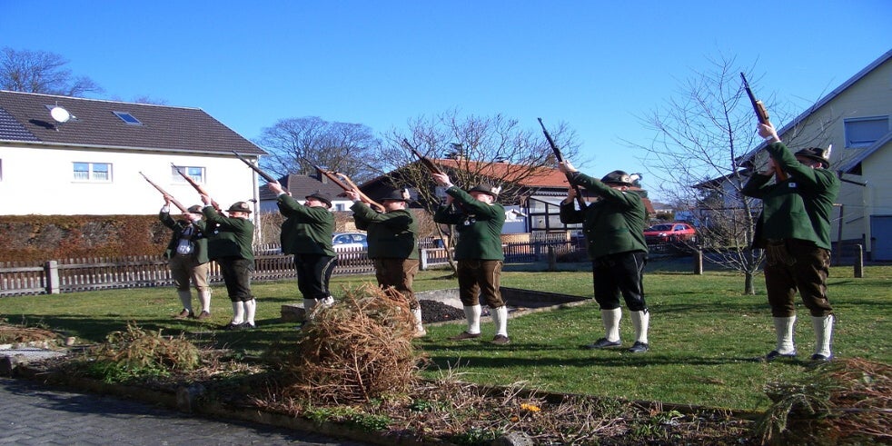Die Salutschützen von links nach rechts: Charitos Emanuel, Reger Fred, Althammer Georg, Rauschhuber Peter jun., Huber Klaus, Fischer Eckard, Oberhauser Ulrich